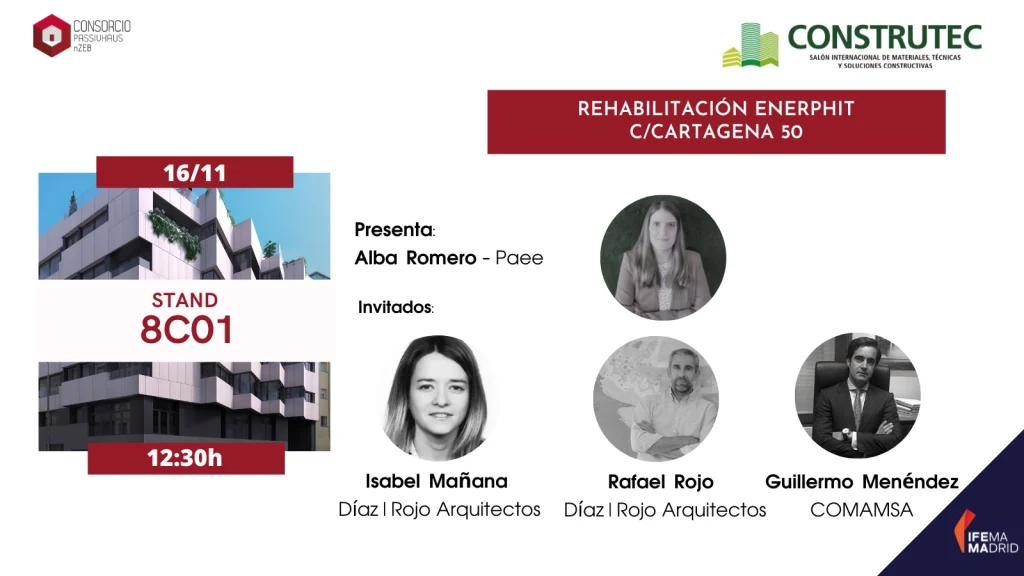En esta mesa redonda hablaremos sobre las particularidades del proyecto Cartagena 50, primera rehabilitación Enerphit de un edificio terciario situado en Madrid donde se proyectan 21 viviendas, oficina, trasteros y garaje.